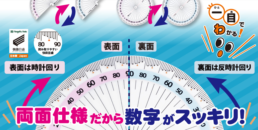 両面分度器 快段目盛シリーズは、読み取りやすい「快段目盛」を採用し、