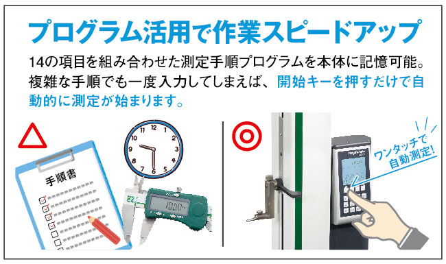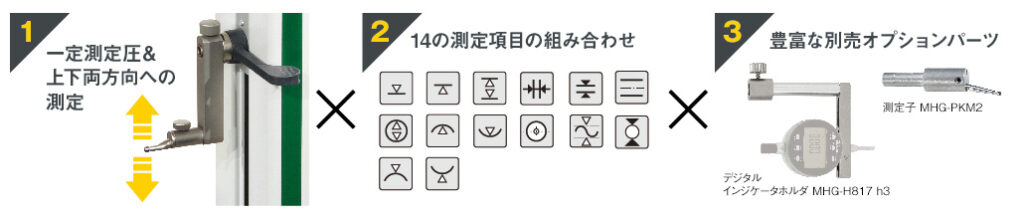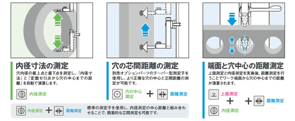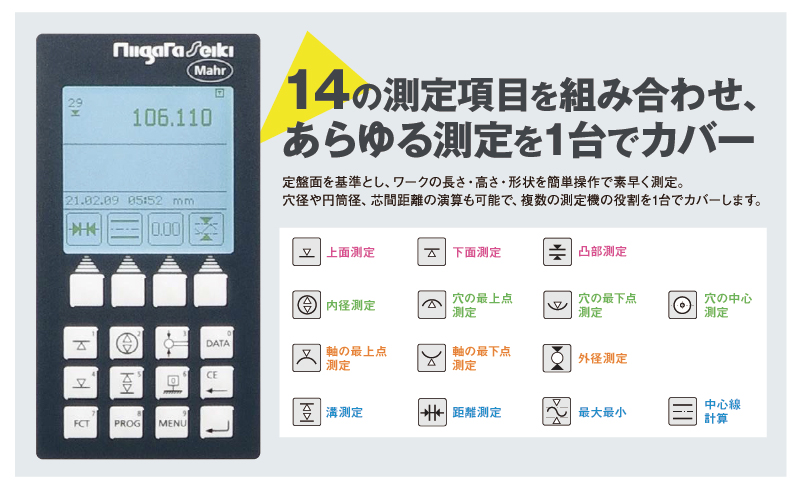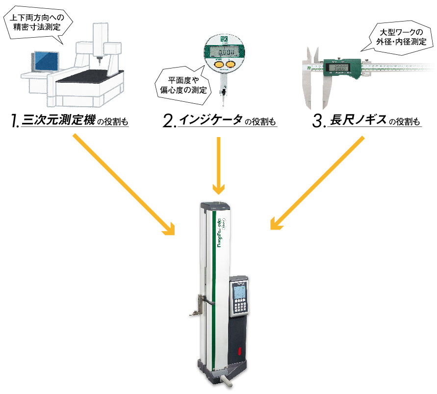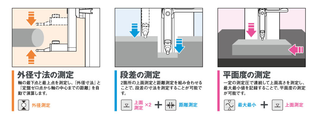 定盤面を基準とし、ワークの長さ・高さ・形状を簡単操作で素早く測定。穴径や円筒径、芯間距離の演算も可能で、複数の測定機の役割を1台でカバーします。