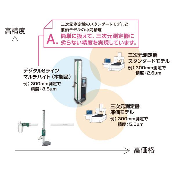 図のように、「デジタルSラインマルチハイト」は三次元測定機のスタンダードモデルと廉価モデルの中間精度です。