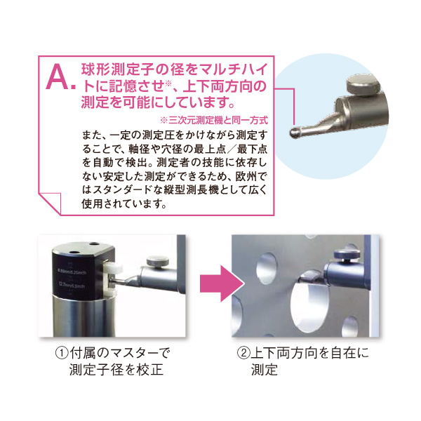 球形測定子の径をマルチハイトに記憶させ、上下両方の測定を可能にしています。