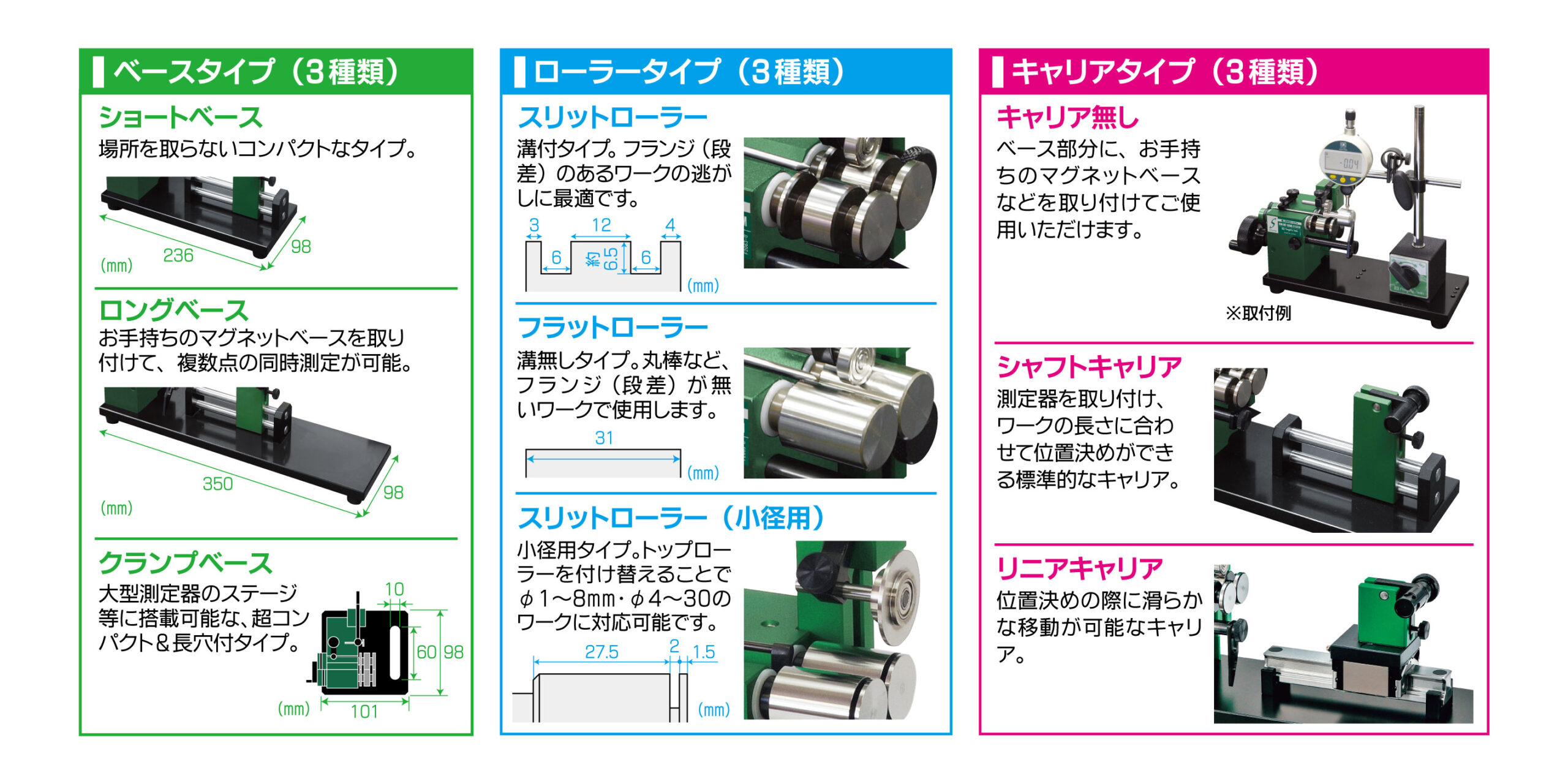 | 品番 | ベースタイプ | ローラータイプ | キャリアタイプ | 測定可能 ワーク外径 | 測定可能 ワーク質量 | 精度 |