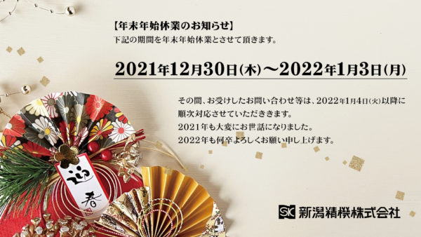 NIIGATA SEIKI BLOG新潟精機ブログ 新潟精機ブログでは、6つのカテゴリに分けて社内外の情報を掲載しています。 HOME新潟精機ブログお知らせ年末年始 休業のお知らせ 年末年始 休業のお知らせ 2021年12月20日 弊社では、2021年12月30日(木)~2022年1月3日(月)まで休業とさせて頂きます。 その間、お受けしたお問合わせ等は、2022年1月4日(火)以降、順次対応させて頂きます。 何卒よろしくお願いいたします。 一覧に戻る