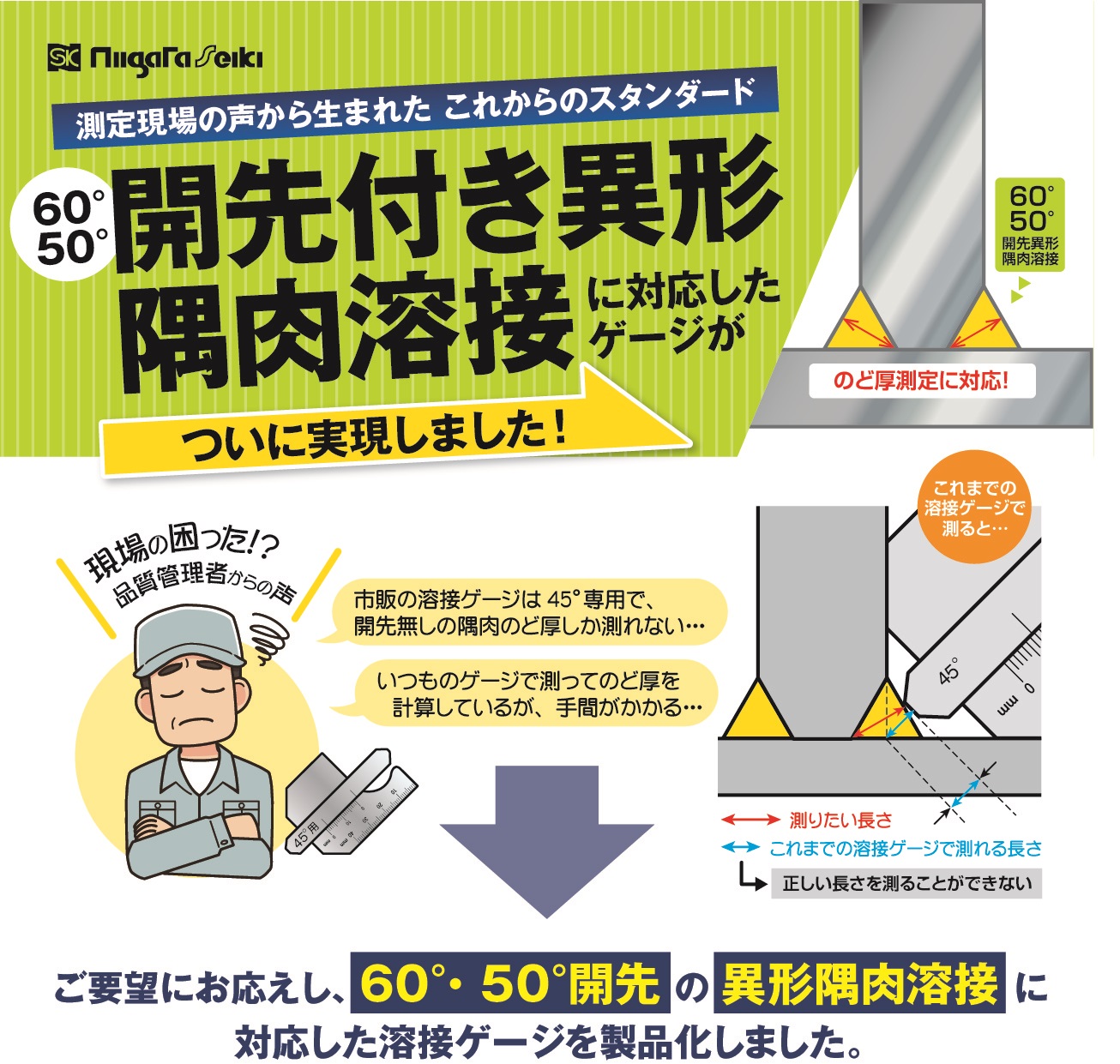 ●測定現場の声から生まれた、開先付きの異形すみ肉溶接に対応した溶接ゲージの新スタンダードモデルです。
