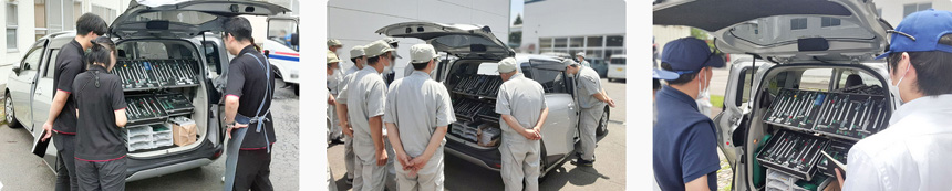 車1台で《直接》お客様のもとへ出向くため、ジャンル問わず様々な測定工具をまとめて見たり、確かめることができます。