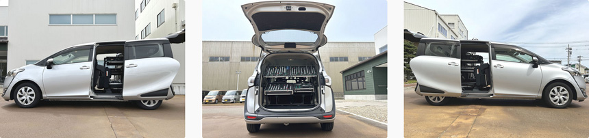 SKキャラバンカーでは、左右リアスライドドア及びリアハッチの3面に測定工具を搭載しています。