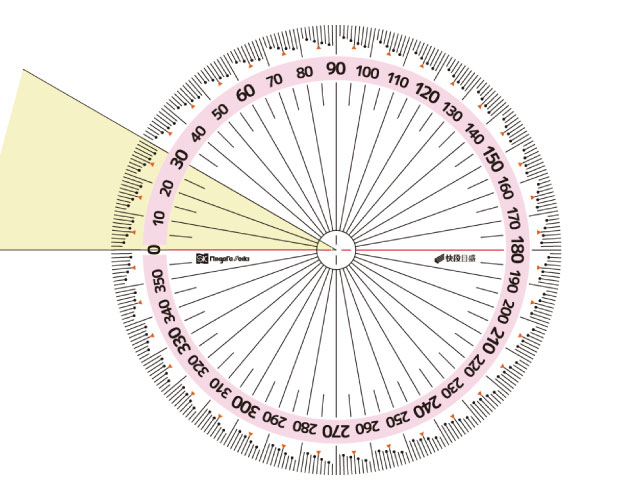 両面全円分度器は基線(0°)が赤線になっていて一目で分かるようになっています。また、中心に穴が開いているため、筆記用具の先端を挿して0°を合わせることも可能です。