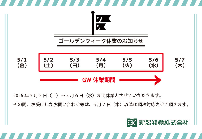 弊社では、2026年5月2日(土)~ 5月6日(水)まで休業とさせていただきます。