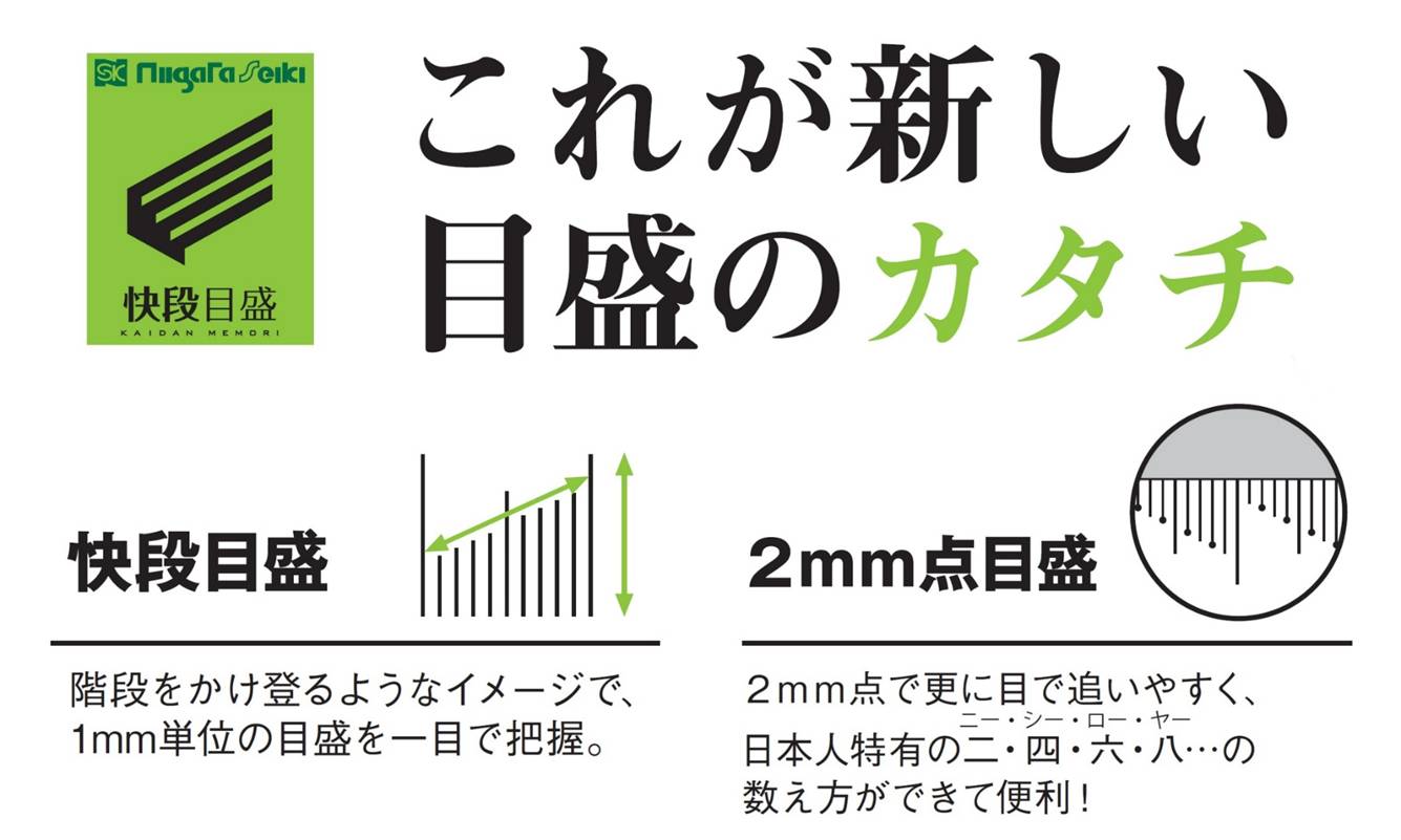 「快段目盛」は、高齢作業員のために開発された目盛です。新潟精機が意匠権を取得した新発想の快段目盛を採用することで、1mm単位の目盛を一目で把握でき、誰にでも目盛が読み取りやすい定規を目指しました。