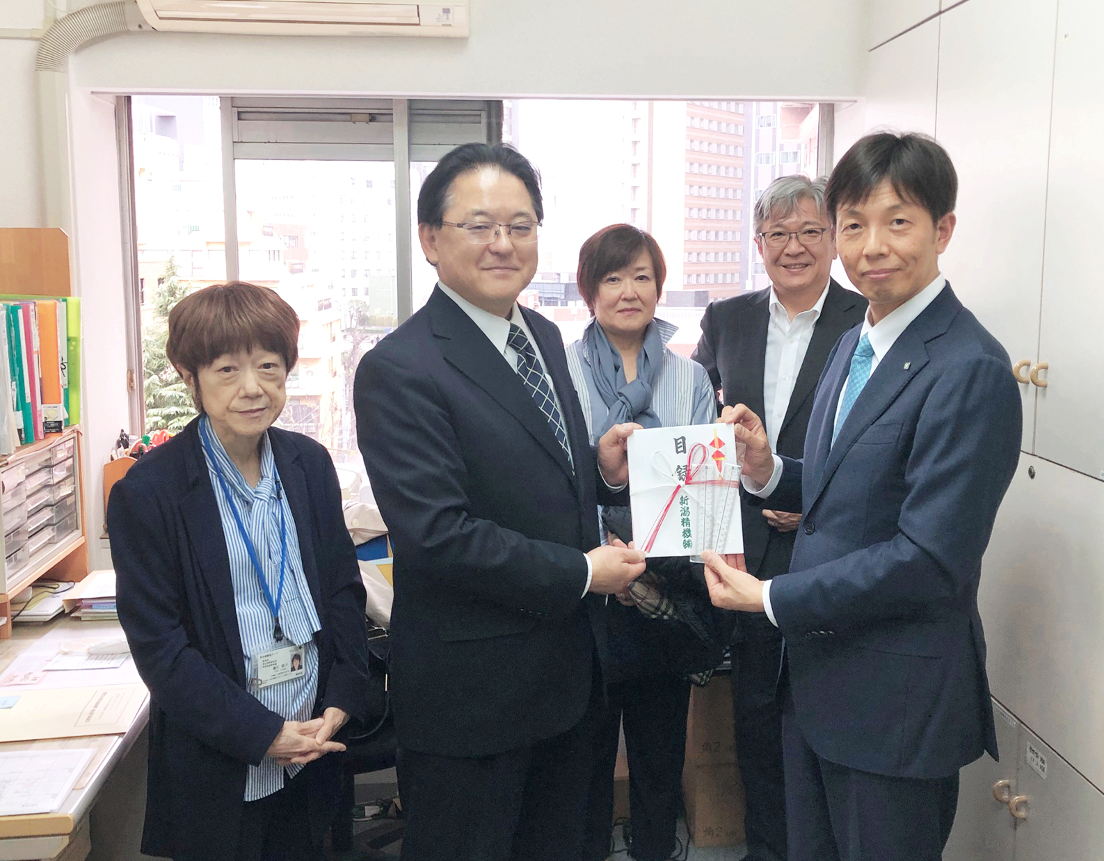 全国特別支援学級・通級指導教室設置学校長協会の喜多好一会長(写真左)へ、弊社社長五十嵐(写真右)から目録をお渡ししました。