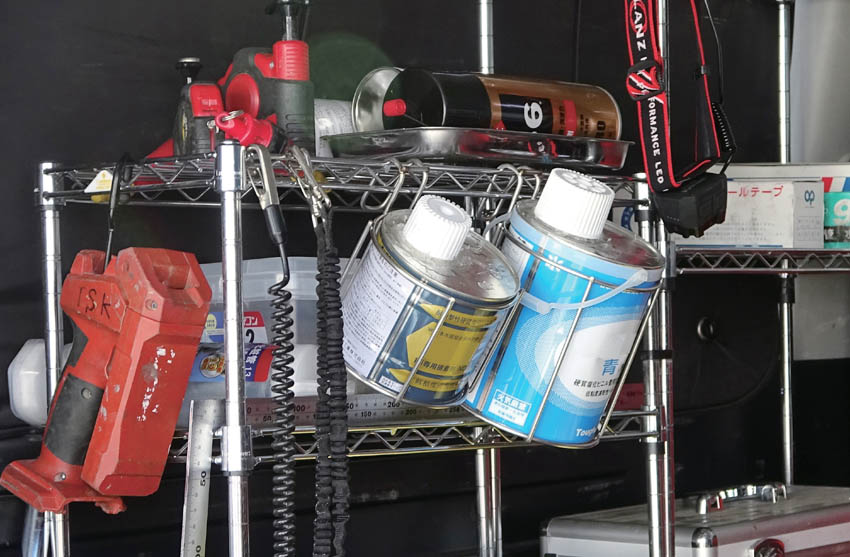 塩ビ管接着剤用ホルダー 脚掛 使用例