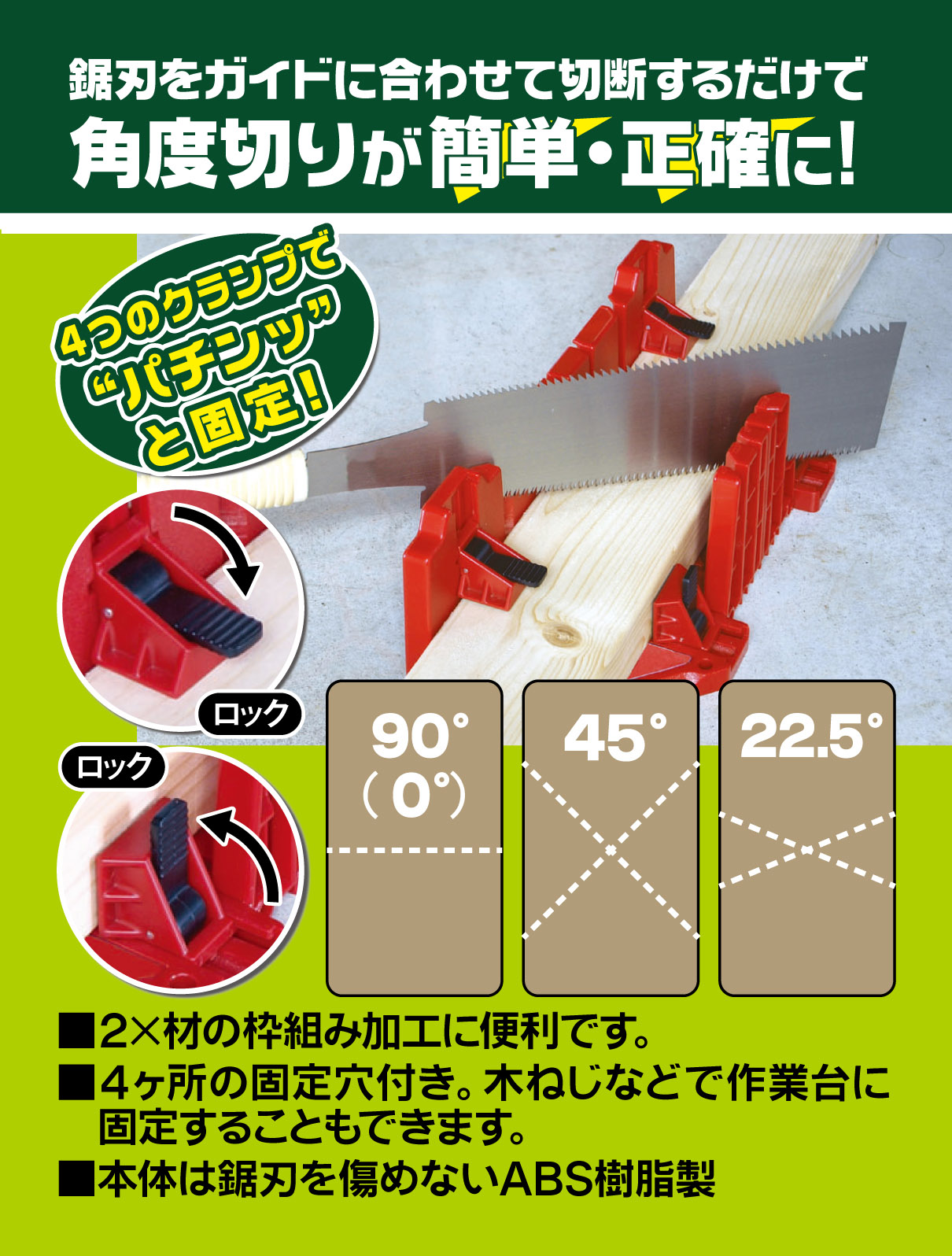 • ●22.5°、45°、90°の溝が切ってあるので手鋸での切断作業が正確にできます。