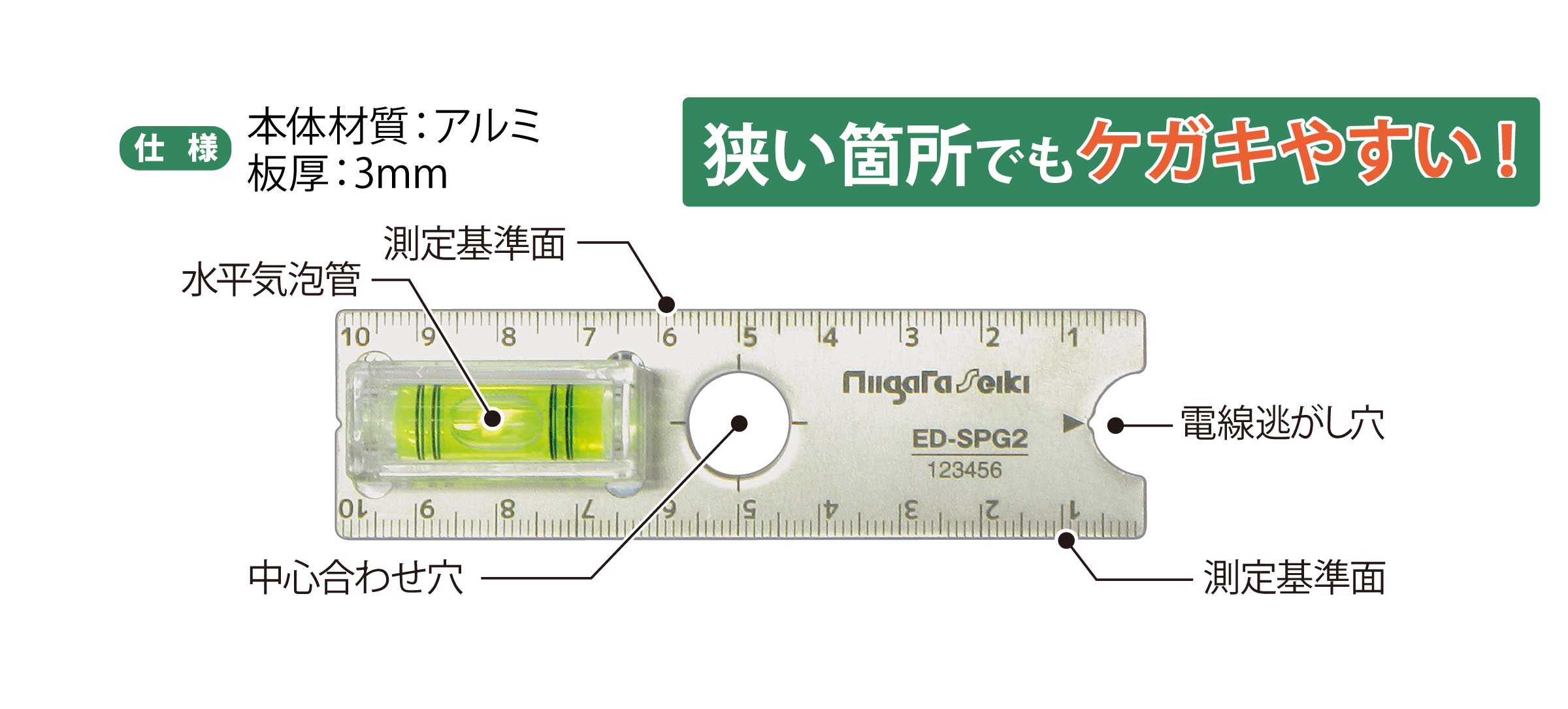 - ●本体厚さ3mmの薄型設計で狭い場所でもケガキやすいです。
