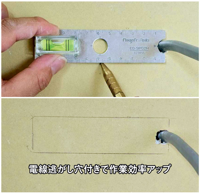 - ●Sプレートも一発ケガキ。極薄仕様のコンセントケガキゲージです。