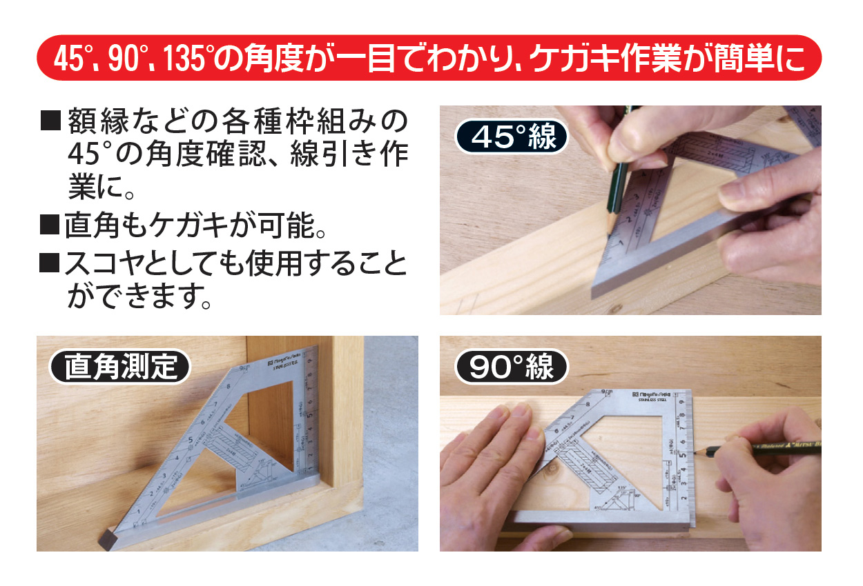 - ●45°、90°、135°の確認やケガキ作業に使えます。