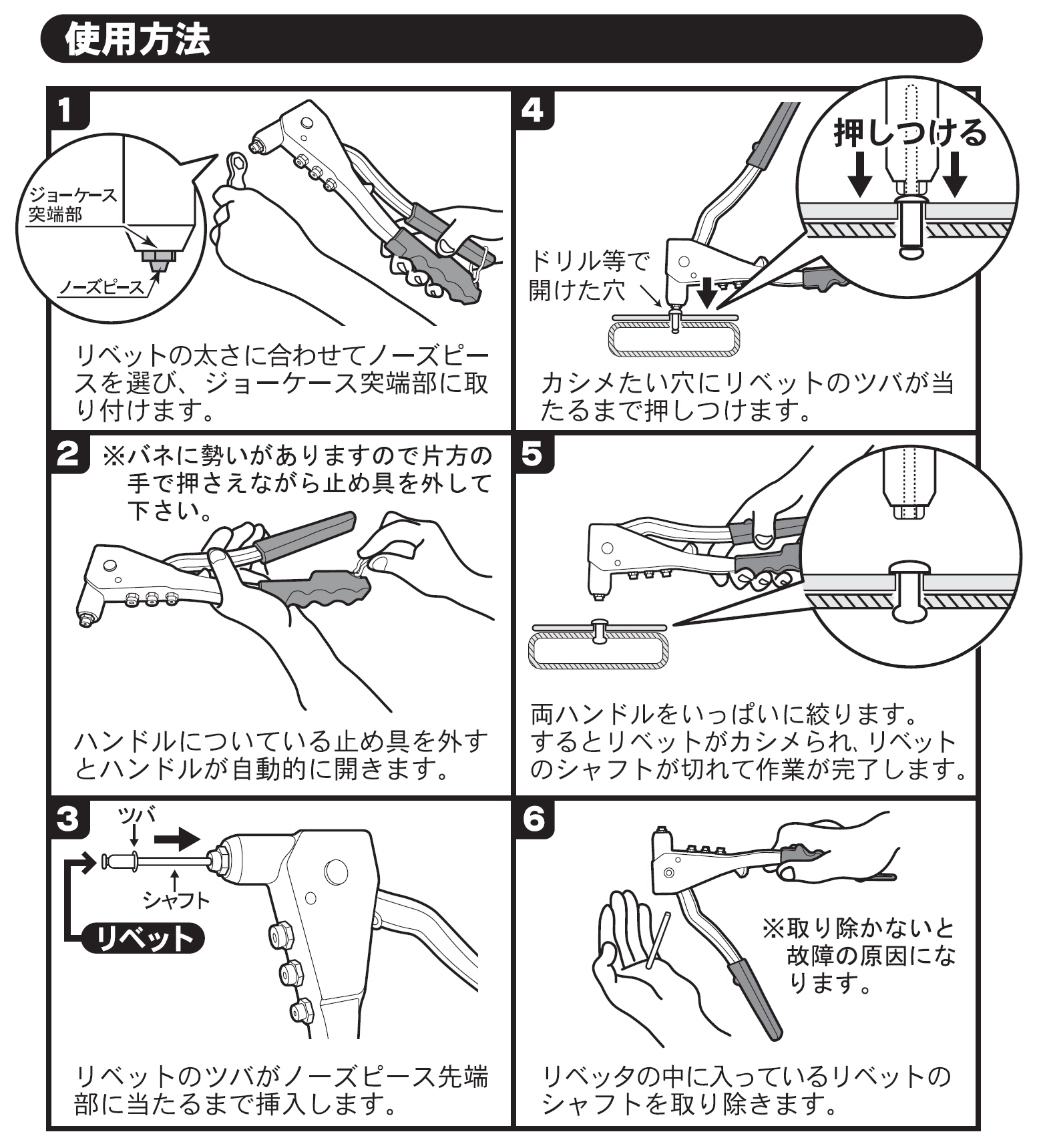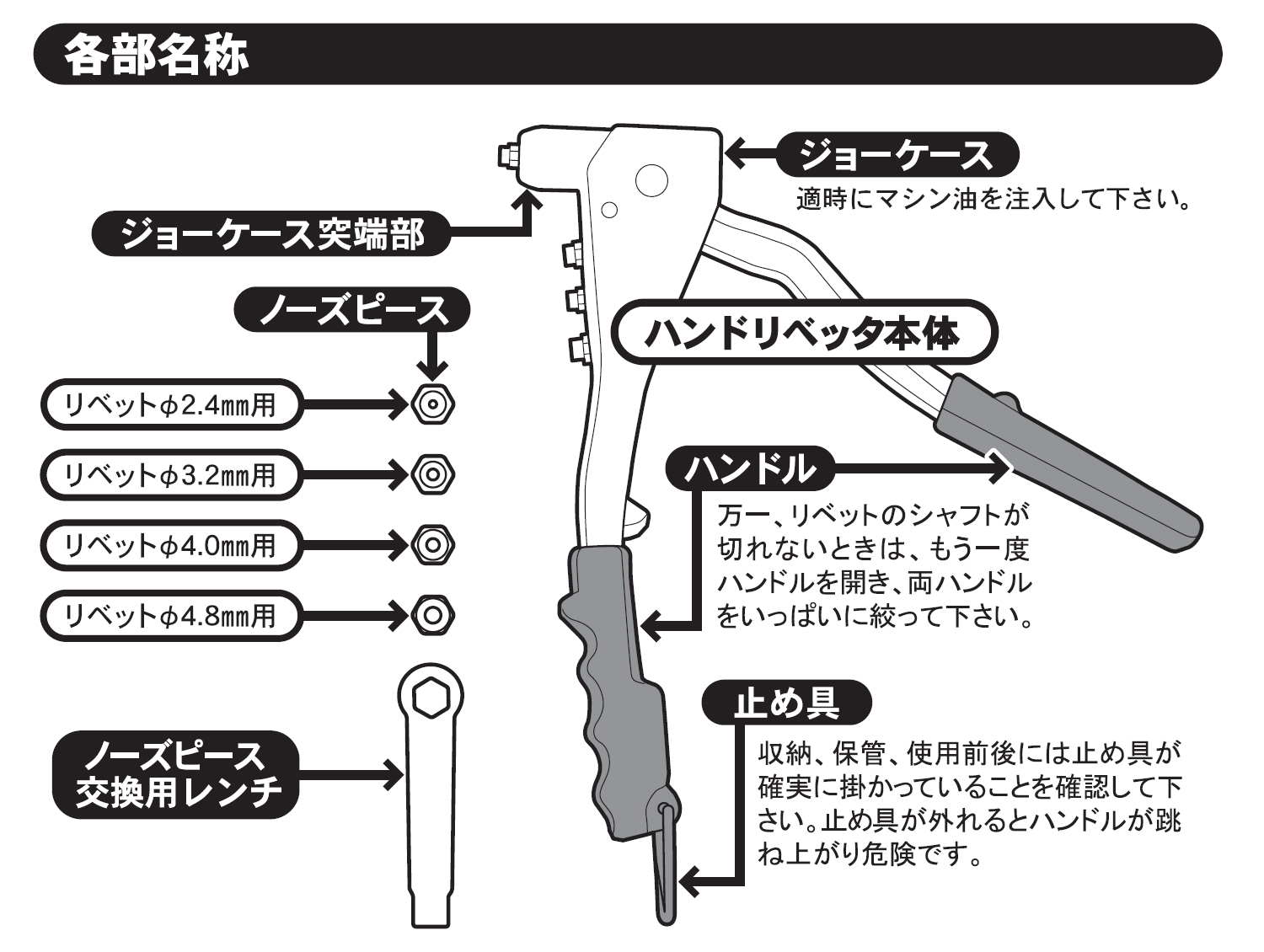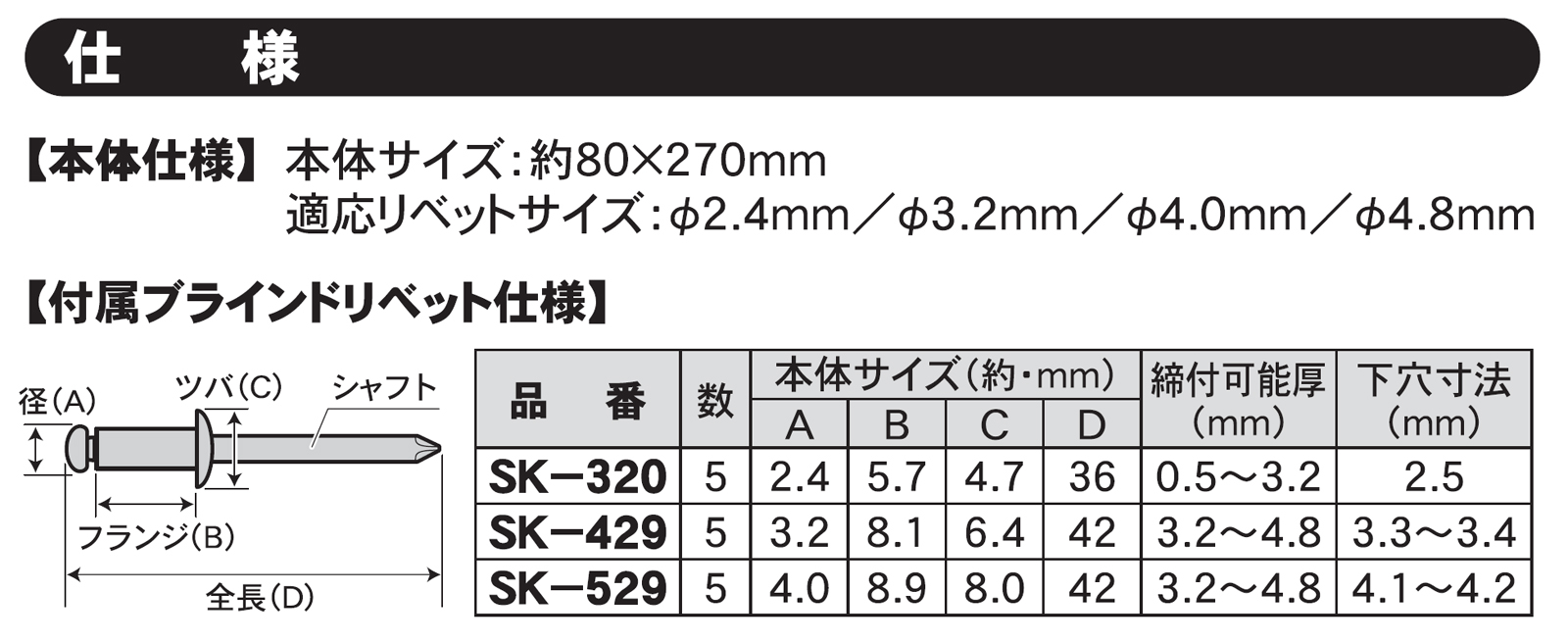 - ●適応リベットサイズ(mm):2.4、3.2、4.0、4.8