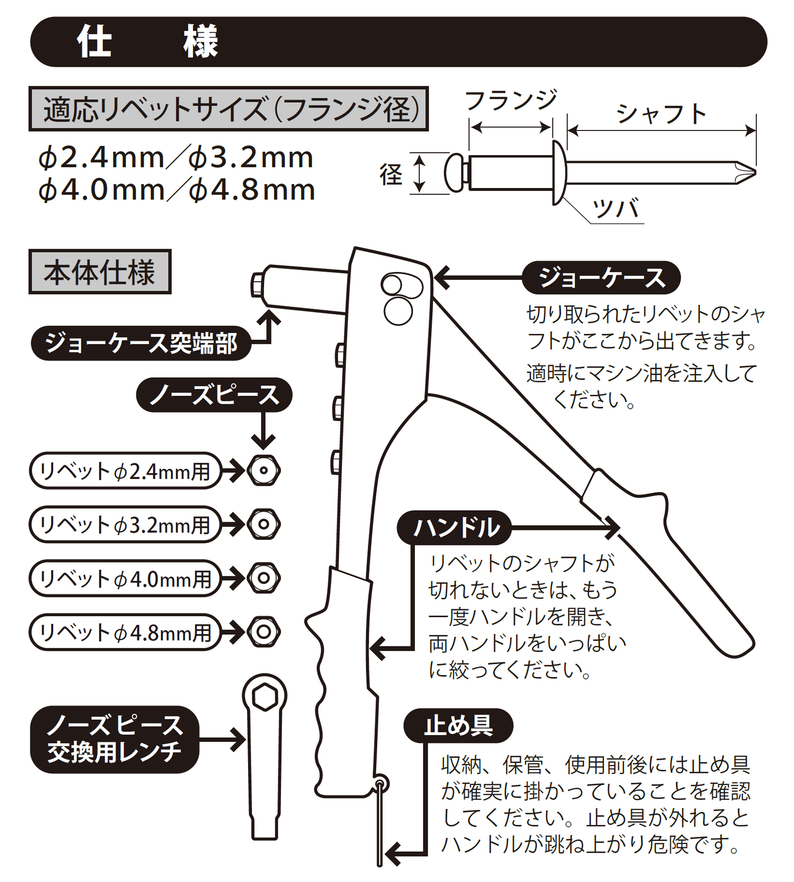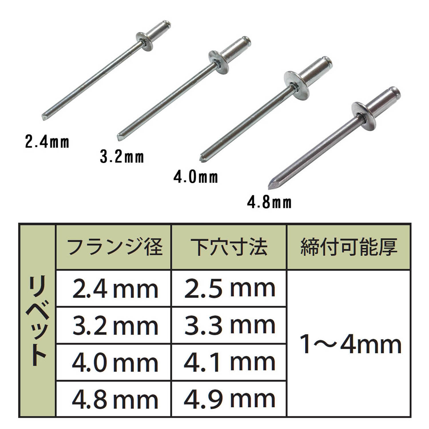 • ●適応リベットサイズ(mm):2.4、3.2、4.0、4.8
