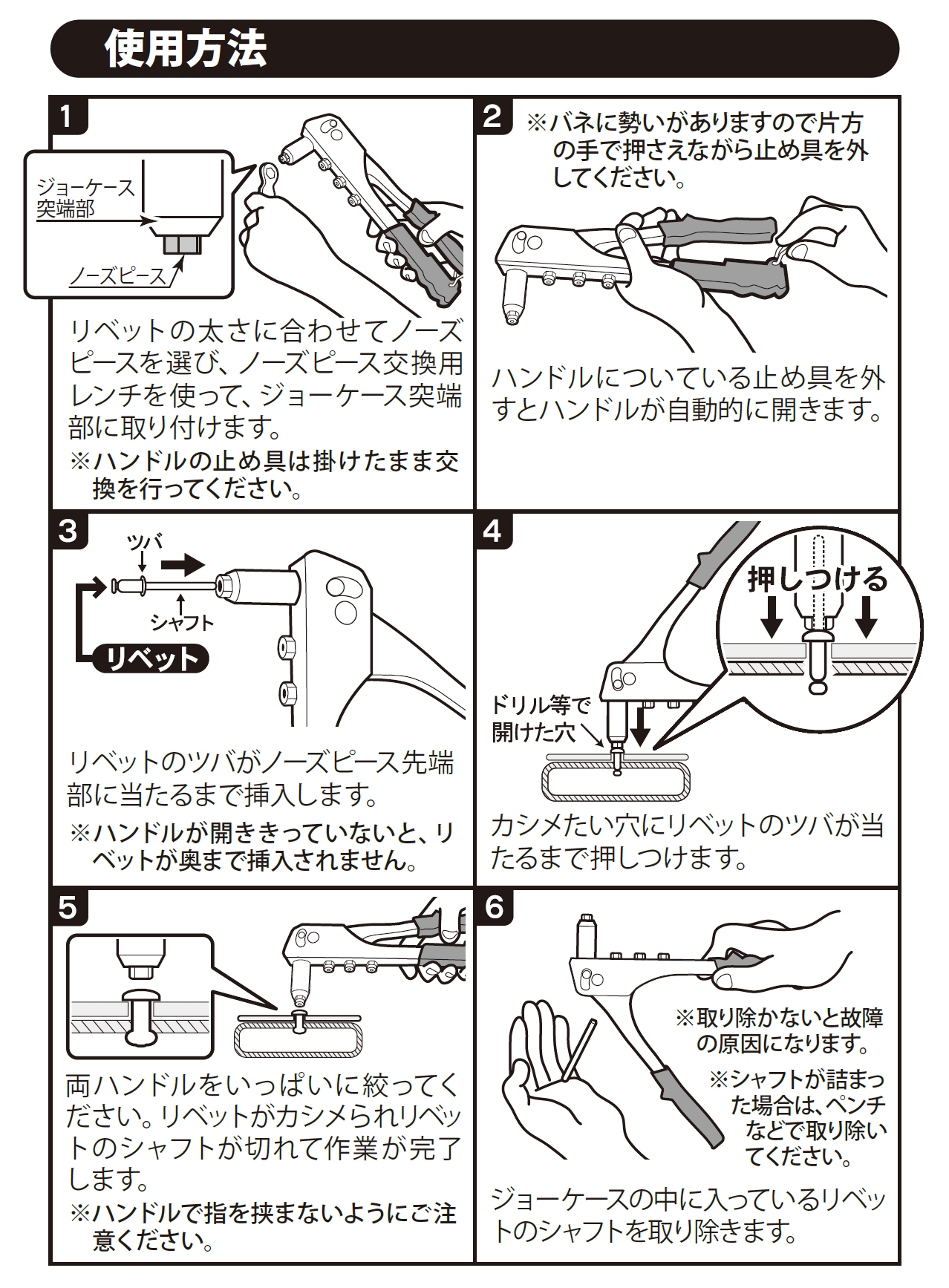 • ●ノーズピースの付け替えで4 サイズのリベットの締結が可能です。
