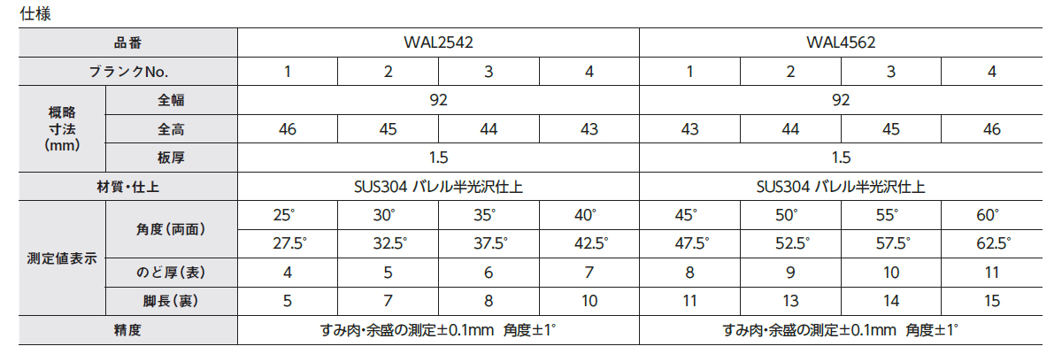 | 00007550 | WAL2542 | 100g | 92mm | 46mm | 1.5mm | 13,500 円 | 4975846007710 |