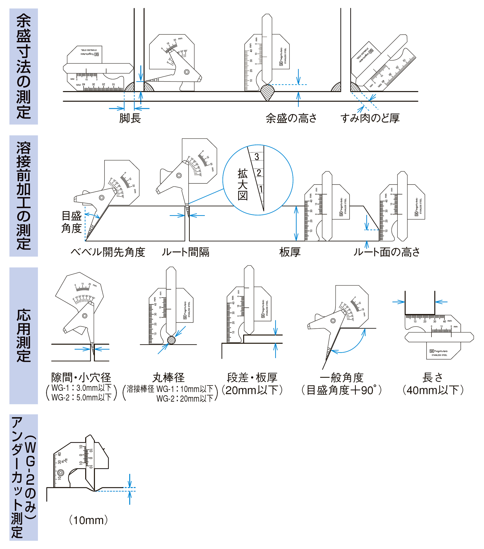 • ●溶接の余盛、すみ肉の大きさ及び角度等の測定に
