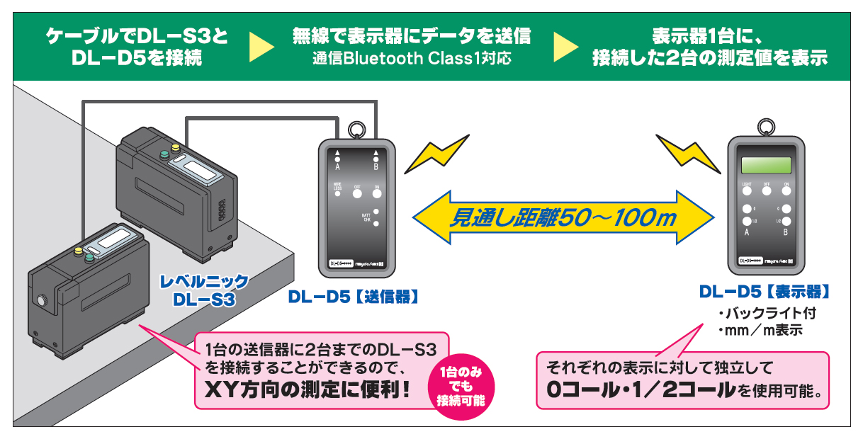 • ●2台のDL-S3シリーズを接続して同時に無線で表示できるため、XY方向の測定が一度にできます。