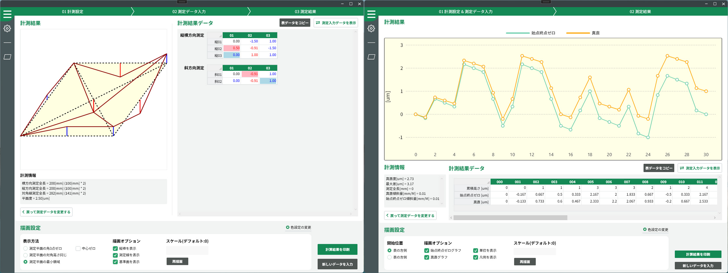 - ●計測と同時に自動計算、グラフ化、定盤の形状を視覚的に把握可能です。