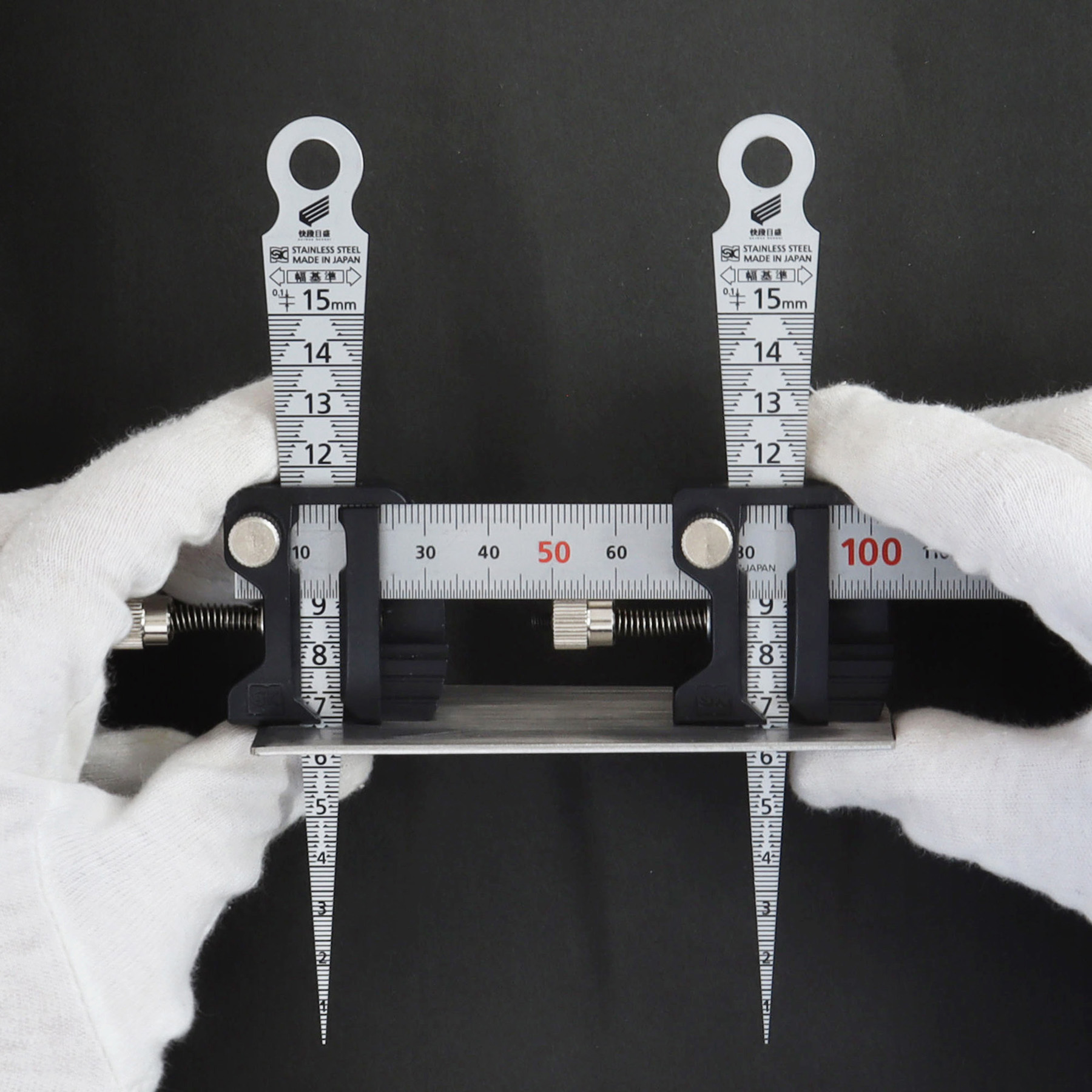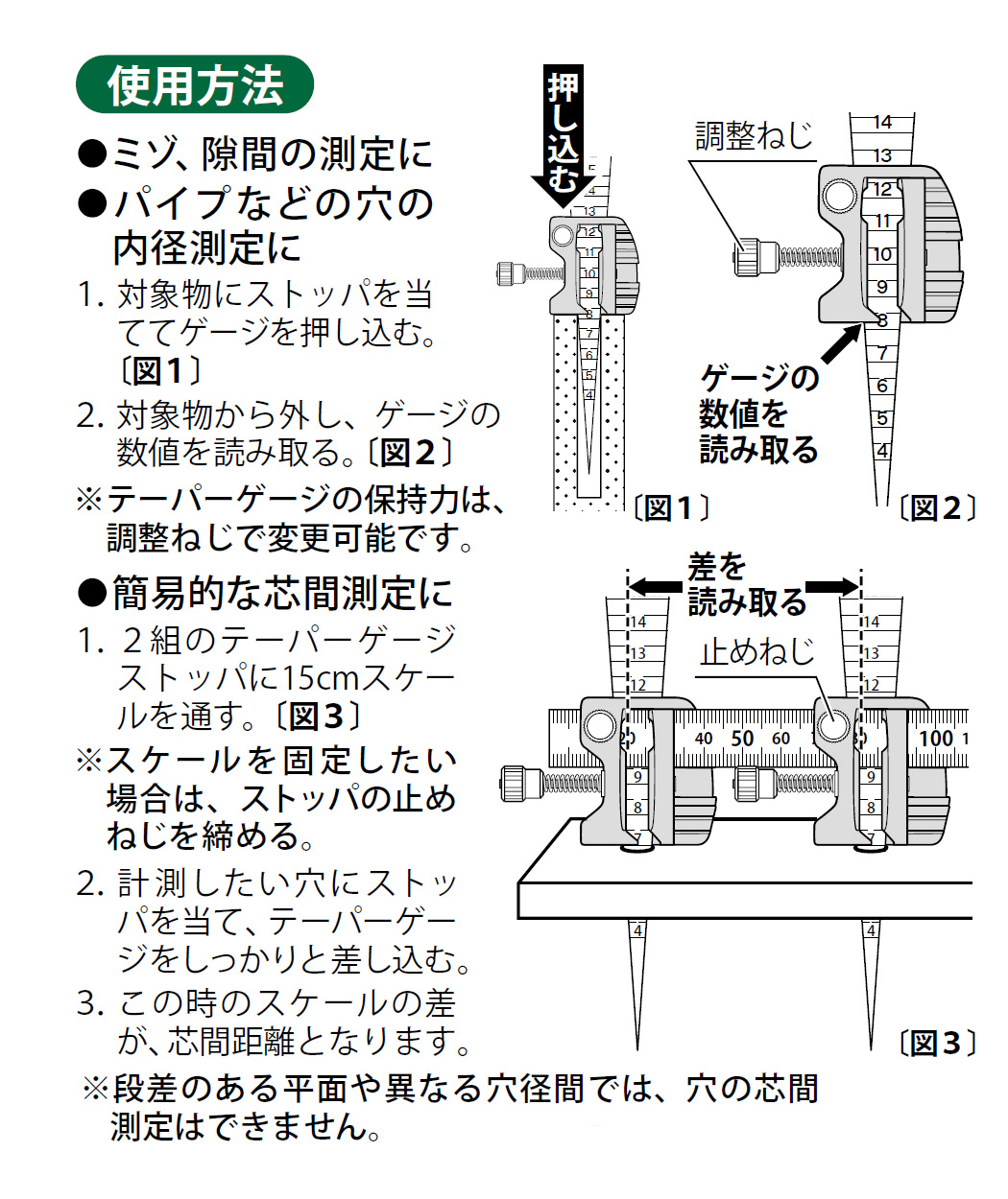 - ●テーパーゲージとストッパ(各2セット)、15cmスケールを使用することで、簡易的な穴の芯間測定を簡単に行えます。